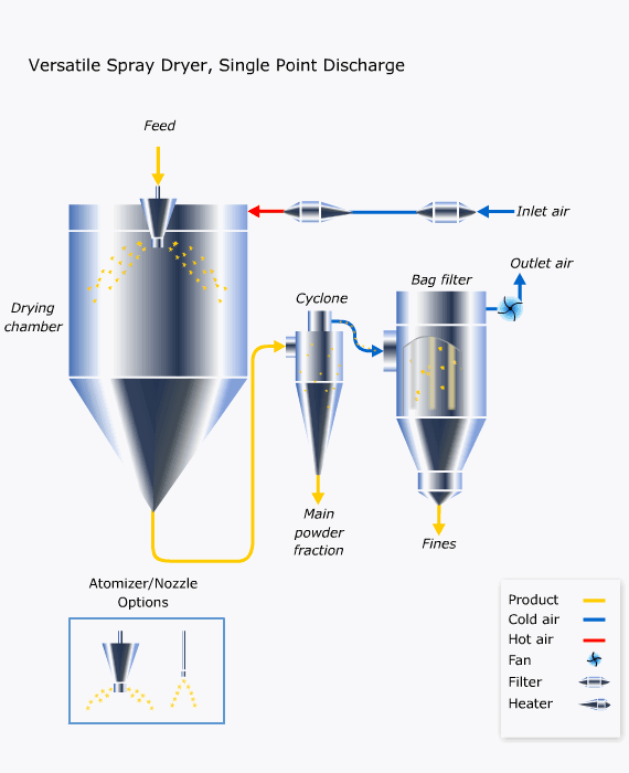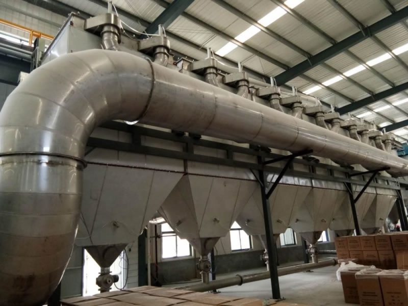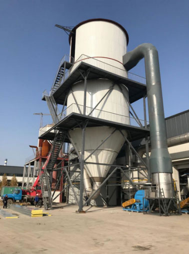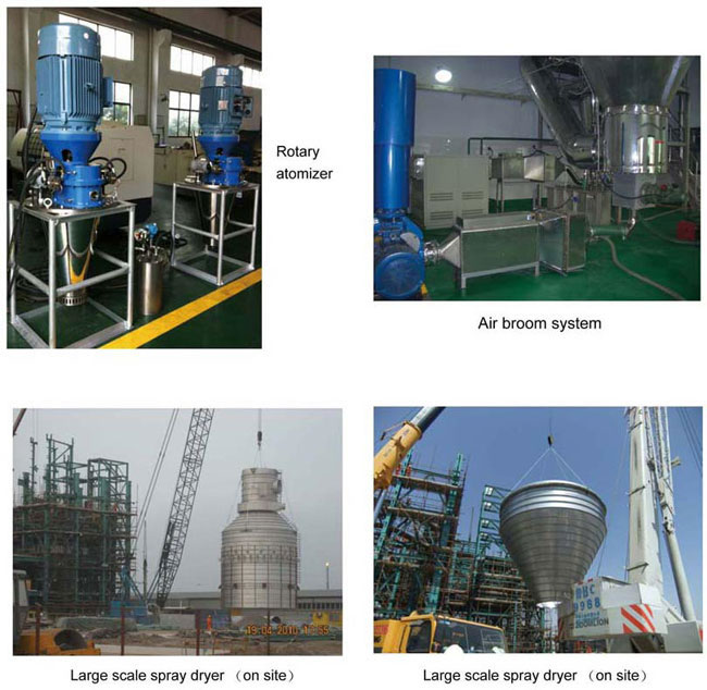 La secadora centrífuga comprime el material de alimentación en el atomizador con boquilla que se encuentra en la parte superior de la torre de secado, para que el material se atomice en pequeñas gotas de niebla. Caerán desde la parte superior de la torre junto con el aire caliente para que pueda secarse. Por lo tanto, el lodo con mayor contenido de sólido puede atomizarse y granularse con presión. Luego se secará para formar partículas esféricas. El producto secado presenta buena fluidez libre.