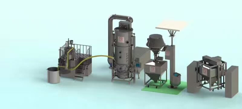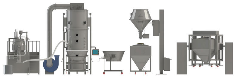 La línea de secado y granulado de dosis sólidas puede combinar de forma efectiva la granulación húmeda, el procesamiento de gránulos húmedos, el secado fluidizado, la granulación en seco, el transporte de material y la mezcla. Esta línea se puede utilizer para la producción de pastillas, cápsulas y gránulos.